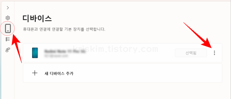 제거 아이콘을 클릭해 현재 연결 상태가 안 좋은 휴대폰 디바이스를 제거합니다. 그리고 바로 아래에 있는 새 디바이스 추가를 누릅니다.