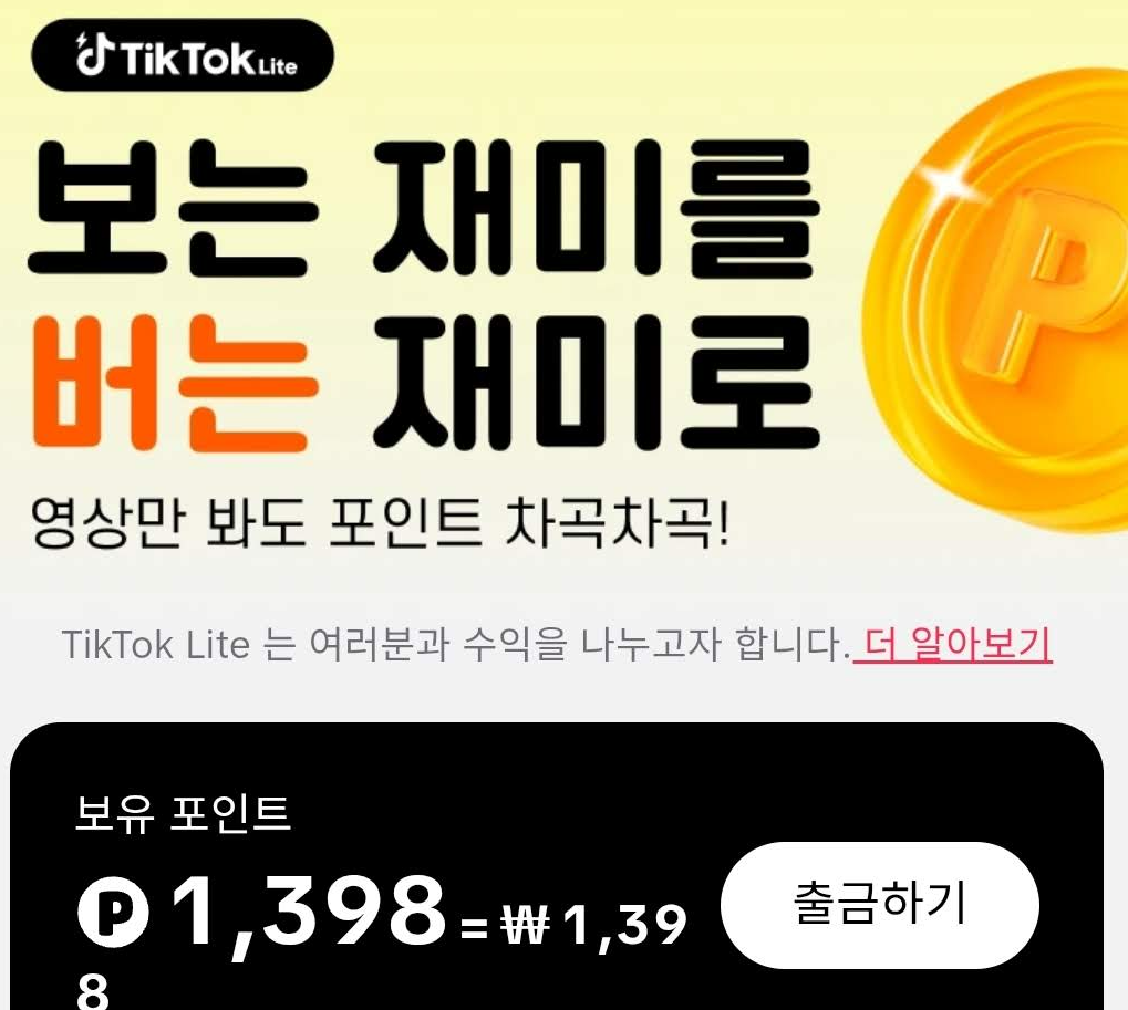 - 틱톡 라이트 (TikTok Lite): 틱톡 라이트의 핵심은 **'사용자 보상과 앱테크'**입니다. 이 앱은 영상을 보는 행위 자체에 보상을 부여합니다. 사용자가 특정 시간 동안 영상을 시청하거나, 친구를 초대하는 등의 미션을 수행하면 포인트를 지급하고, 이 포인트를 현금으로 바꿀 수 있습니다. 즉, 틱톡 라이트는 앱테크(앱+재테크)를 통해 새로운 사용자를 유입하고 활성도를 높이는 전략을 사용합니다.