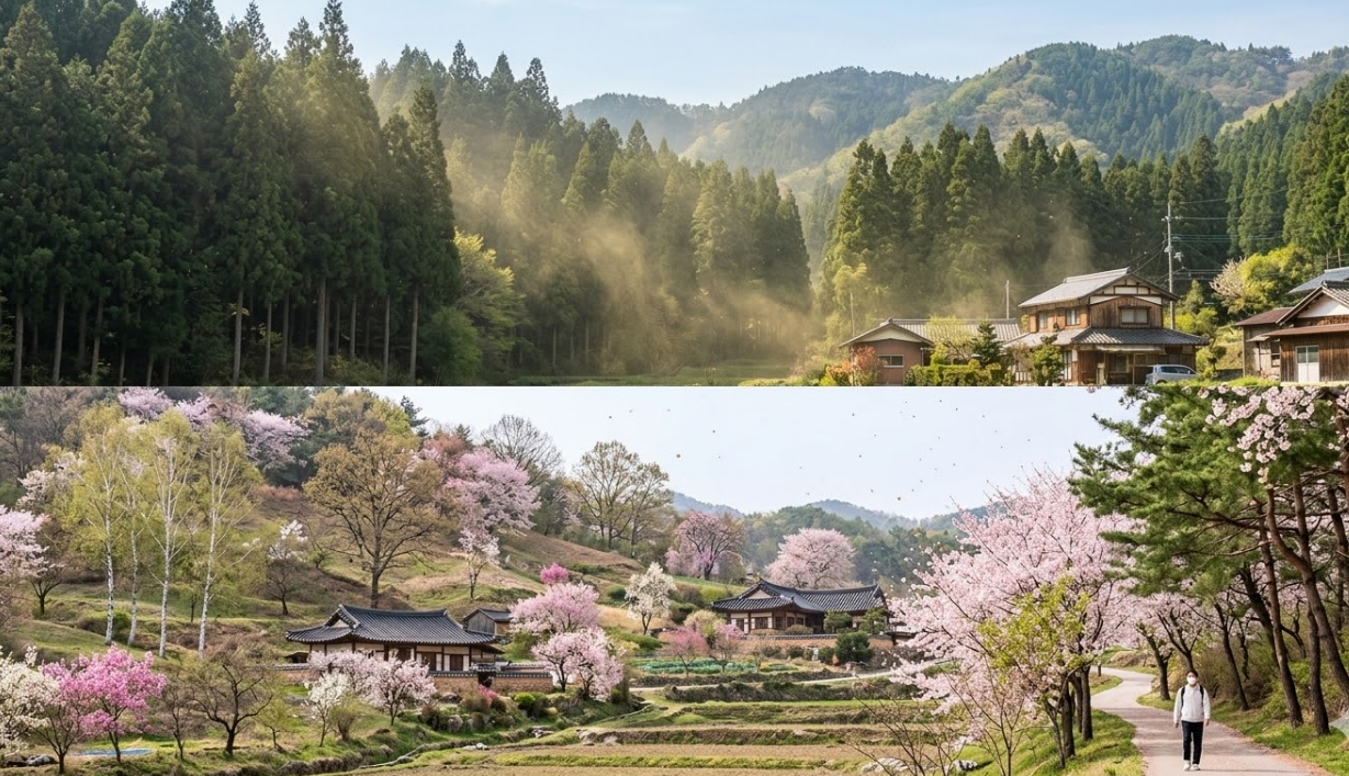 역사적 배경: 과거 일본이 전쟁 후 복구를 위해 성장이 빠른 삼나무를 전국 산지에 엄청나게 심었습니다. 이 나무들이 자라나 이제는 매년 봄마다 엄청난 양의 꽃가루를 뿜어내는 꽃가루 폭탄이 된 것이죠.