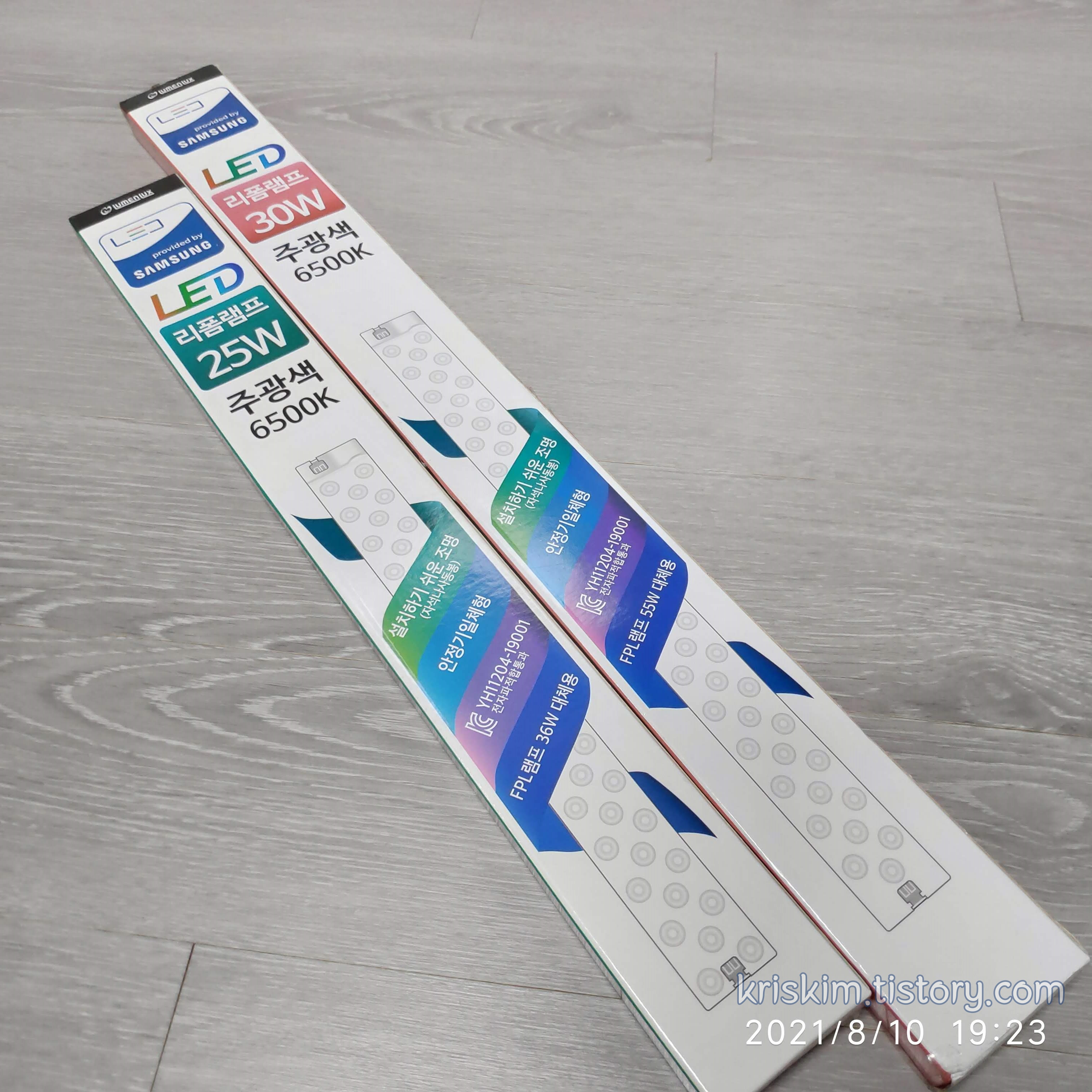 주방에 있는 LED 등기구가 깜빡이더니 고장이 나, LED 모듈을 구입해 교체했습니다. 제품은 중국 SUNSEC Co., Ltd. 에서 제조해, LUMENLUX에서 수입해 판매하는 제품으로 초보자도 설치 및 교환하기 편리한 "안정기 일체 형 LED 리폼 램프 25W / 30W" 입니다. 중국 제품이지만, 삼성 LED 칩을 사용한다기에 이 제품을 선택했습니다. 동일한 제품을 2개 사면 좋겠지만 30W가 1개만 남아서, 30 + 25W 조합을 사용하기로 했습니다. 기존에 주방에는 50W가 있었으니, 조금 더 밝게 되겠습니다. 참고로 LED 25W는 FPL팸프 36W를 대체할 수 있고, 30W는 FPL팸프 55W를 대체할 수 있다고 합니다.