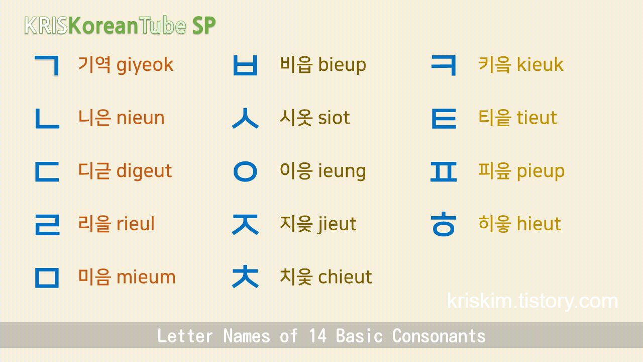 Like A (ay), B (bee), C (cee)... of the alphabet letters, Korean Hangeul consonants also have names. Let's take a quick look at the name of 14 basic consonants in Hangeul.